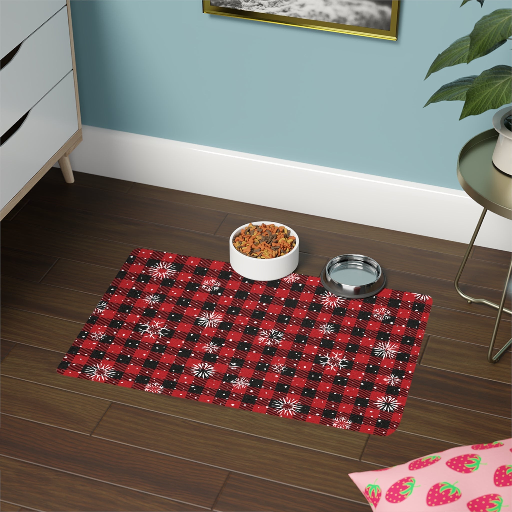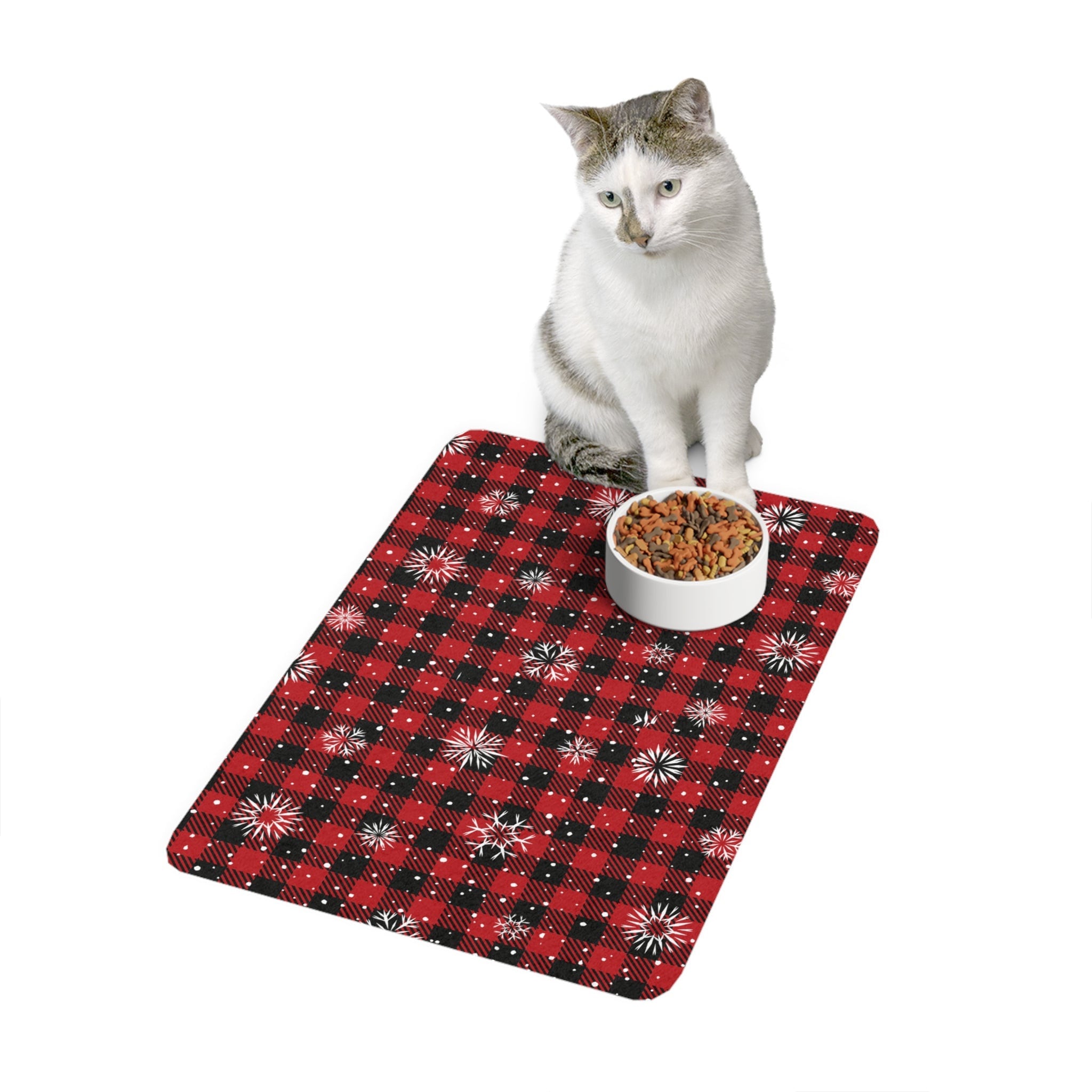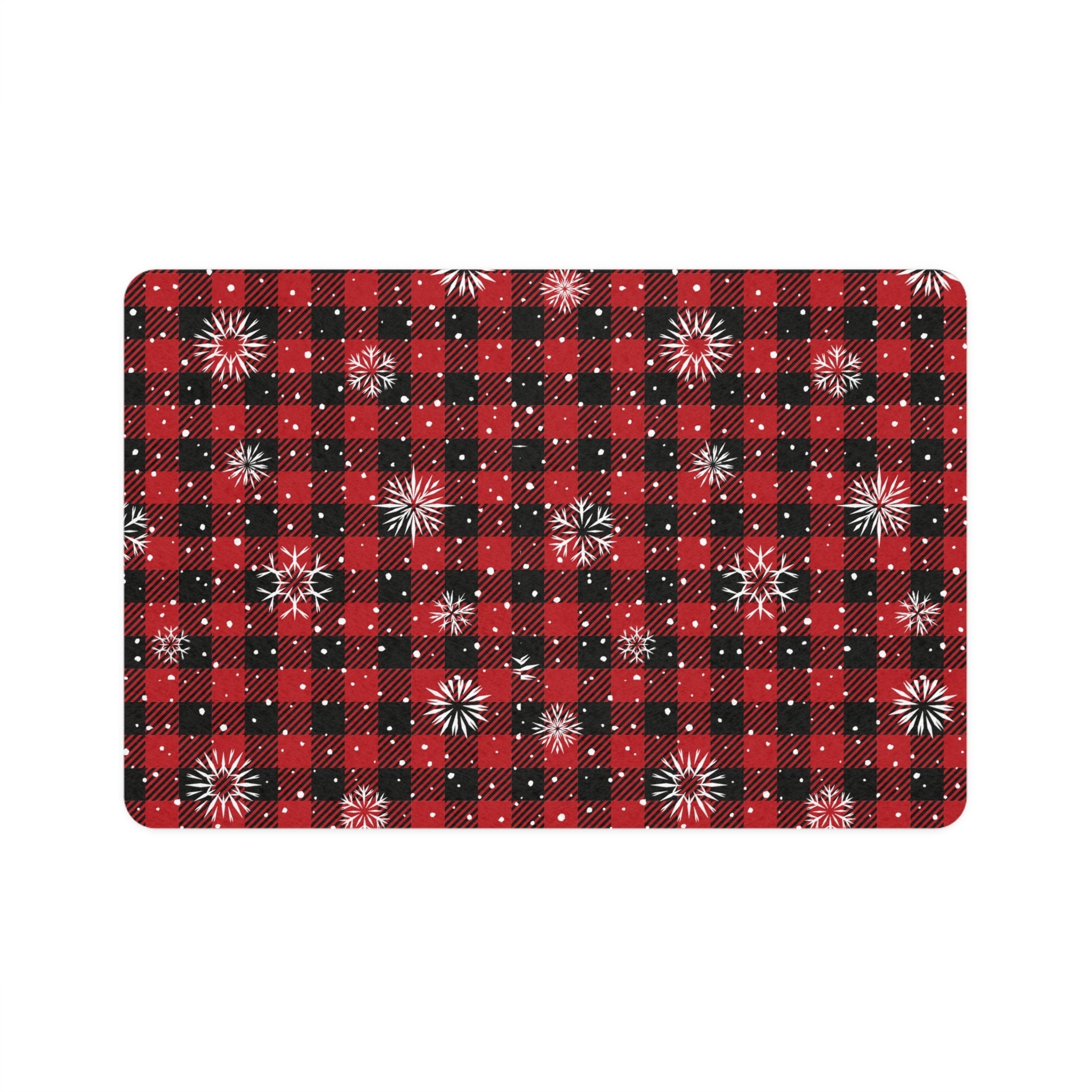 Introducing our Christmas-themed pet food mat, designed to minimize mess and elevate your pet's dining experience. Featuring a festive red and black buffalo checkered print with snowflakes, this mat combines practicality with style. Crafted with a non-slip rubber base, it stays securely in place, even during the most enthusiastic meals by your furry friends.