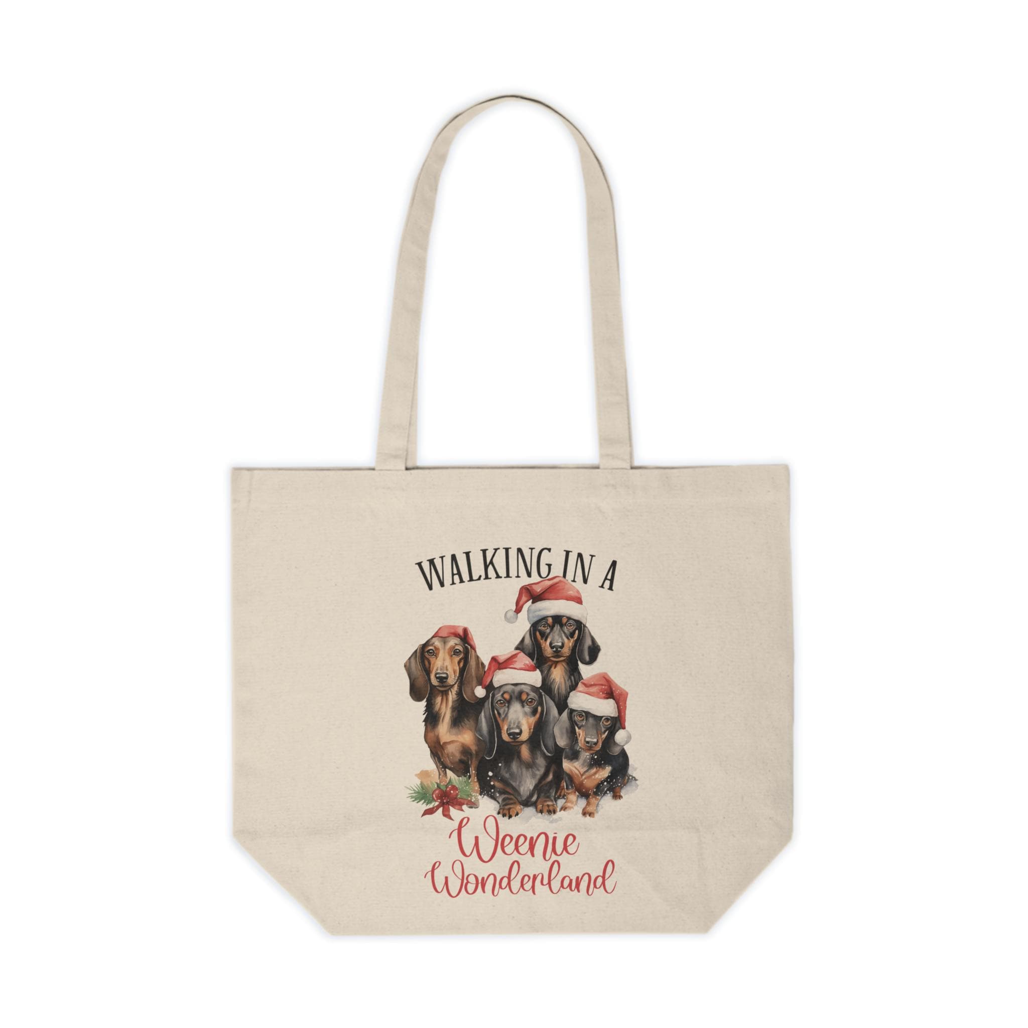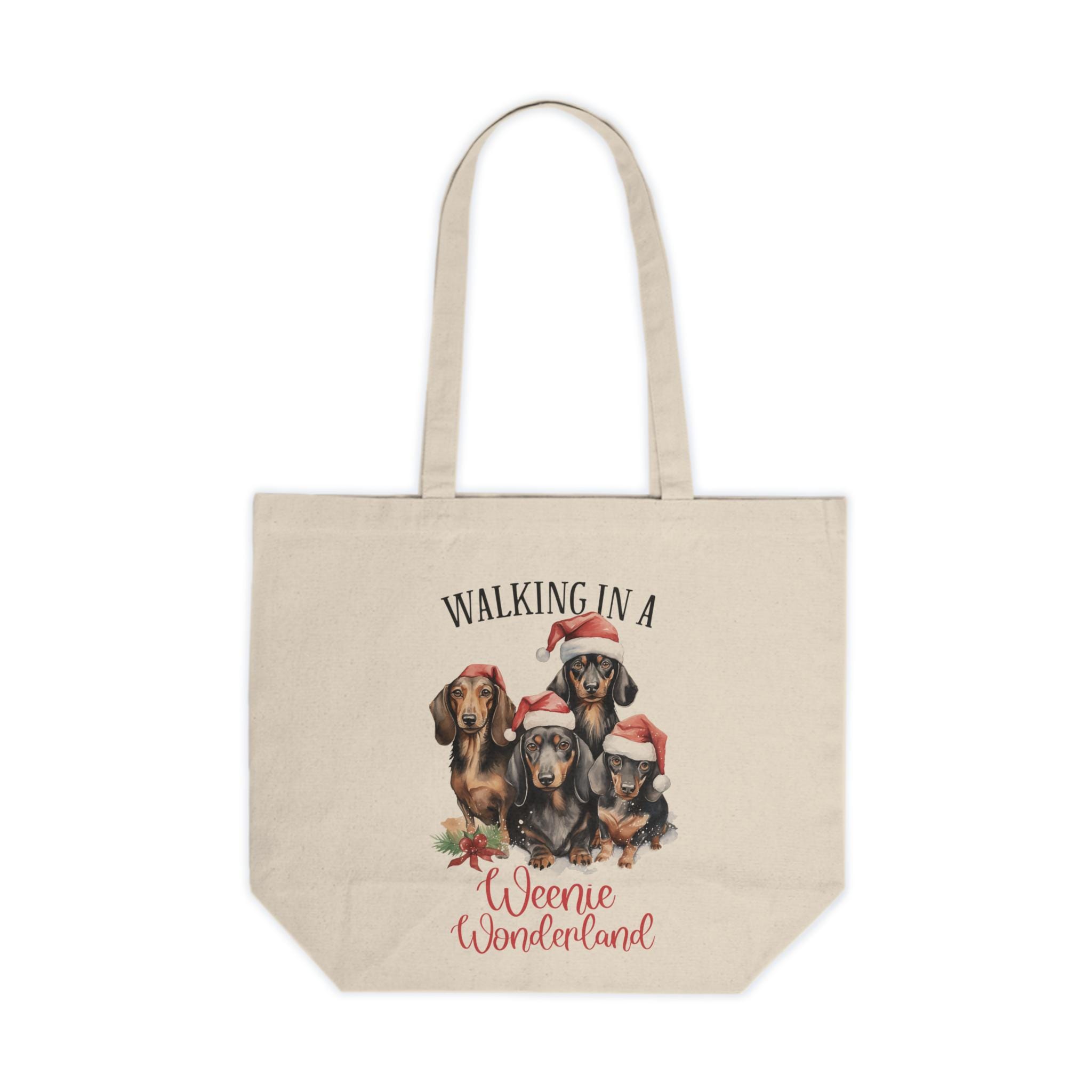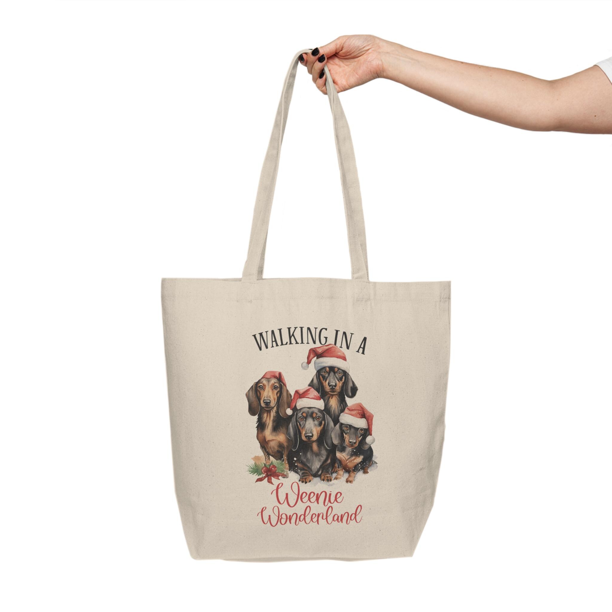 This Weenie dog Christmas Print Canvas Tote Bag is a festive and humorous design perfect for Weenie dog and dachshund lovers. It is a reusable eco-friendly bag with the slogan 'Walking in a Weenie Wonderland' ideal for the holiday season. This tote is relevant to those who love Weenie dogs and enjoy quirky designs, making it a great gift for Christmas and other festive occasions.