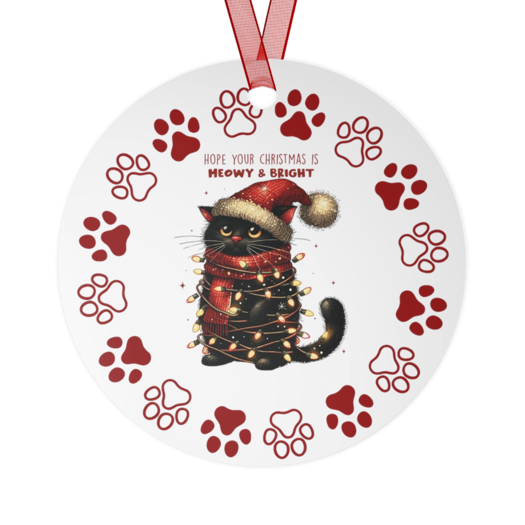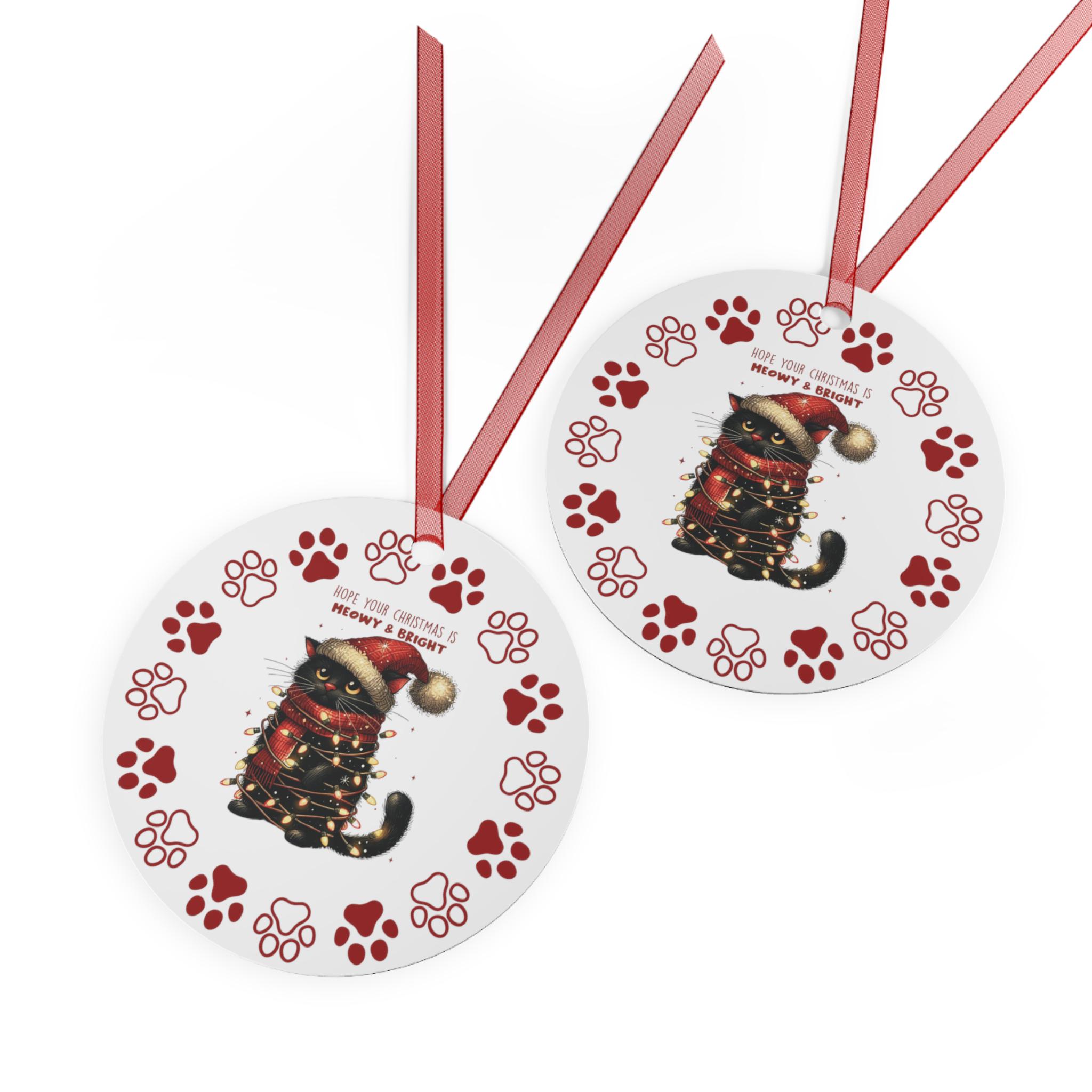 Festive and charming Christmas ornament featuring a black Christmas cat with the message 'Hope Your Christmas is Meowy and Bright'. Perfect for cat moms and dads looking to add a touch of feline fun to their holiday decor. Ideal for cat lovers celebrating Christmas.