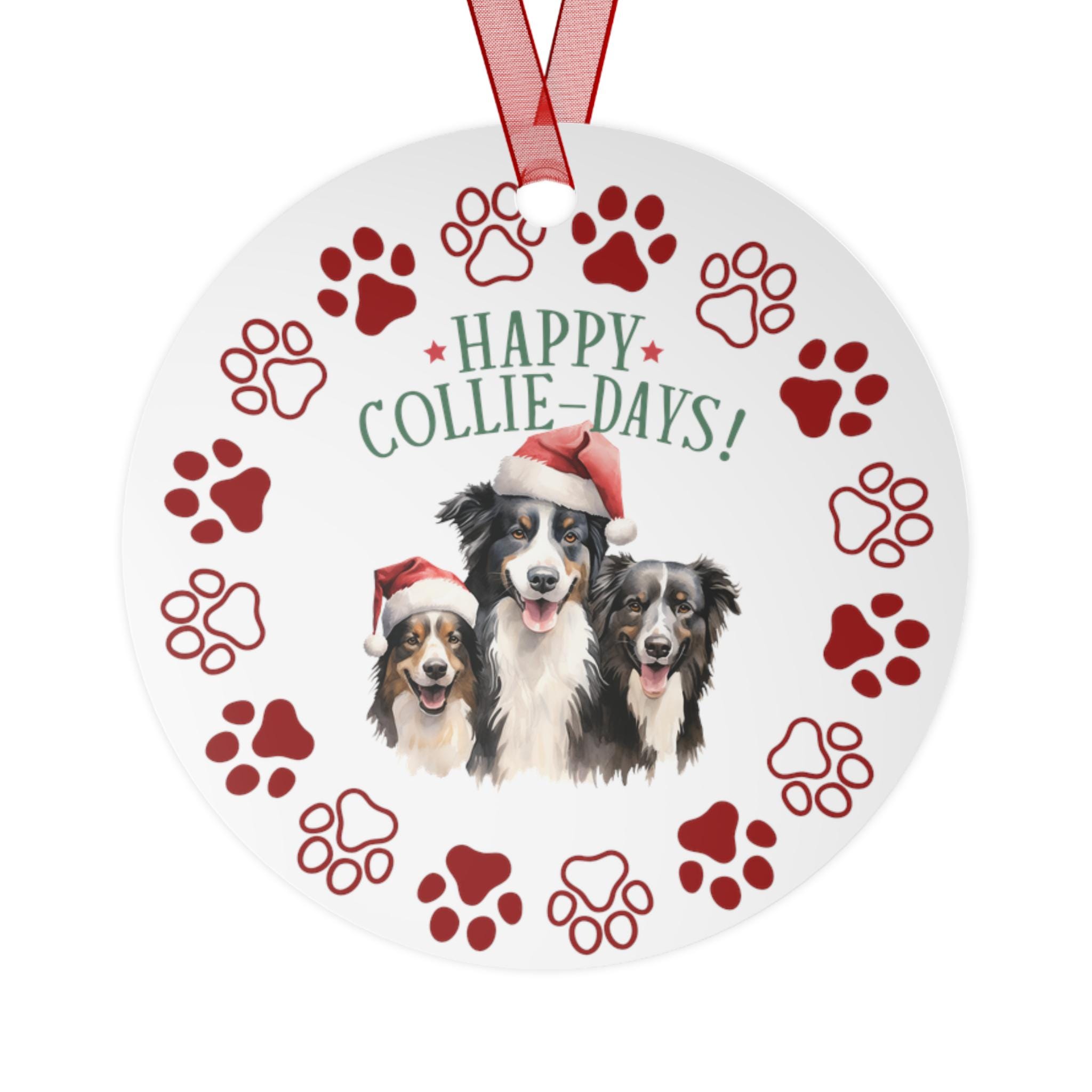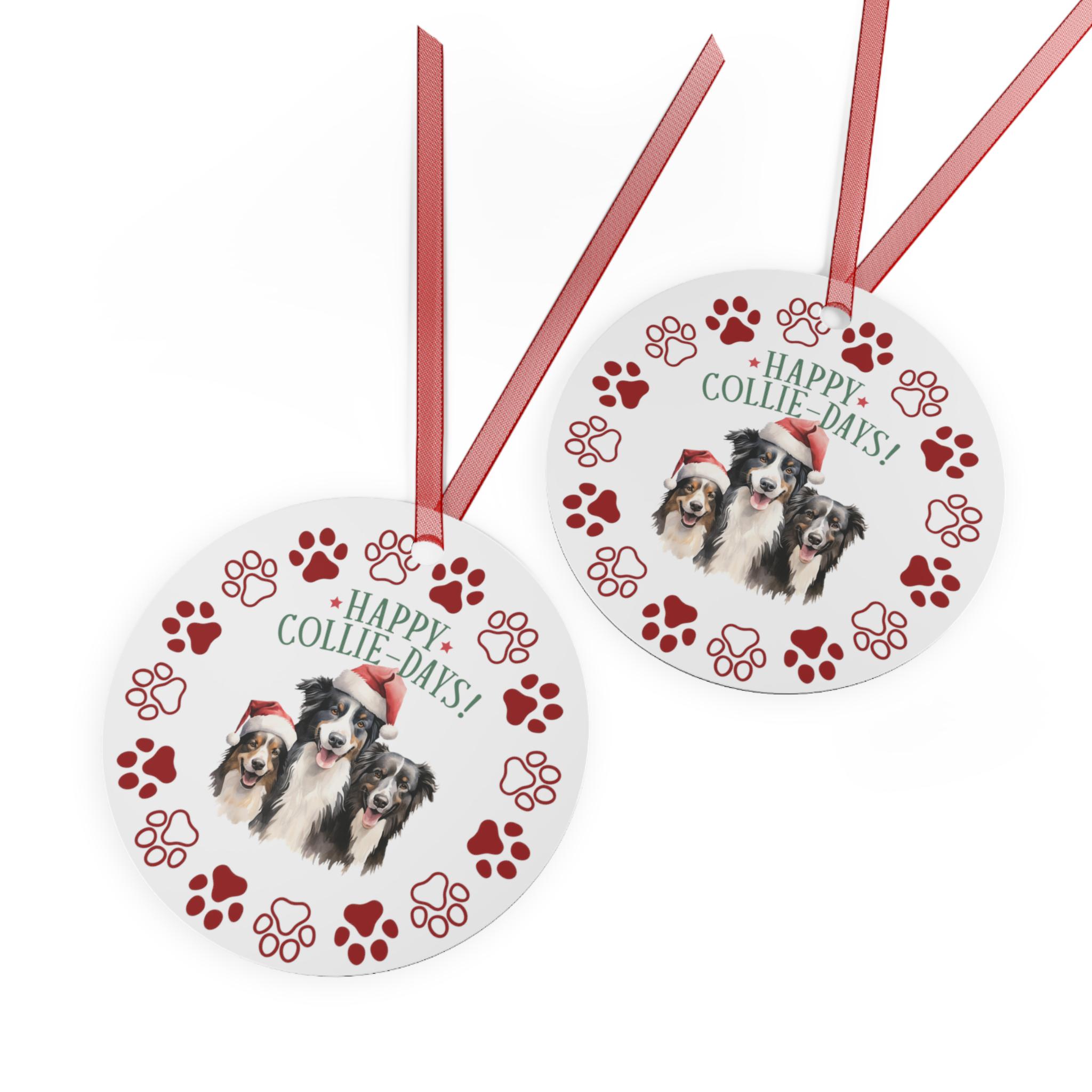 This Round Red Paws Collies Christmas Ornaments feature a 'Happy Collie-days!', design on both sides, making them a festive and unique addition to any dog lover's Christmas tree. Perfect as a holiday gift for collie dog moms or dad, these ornaments come in round and vibrant colors, made from durable aluminum material with a glossy finish.