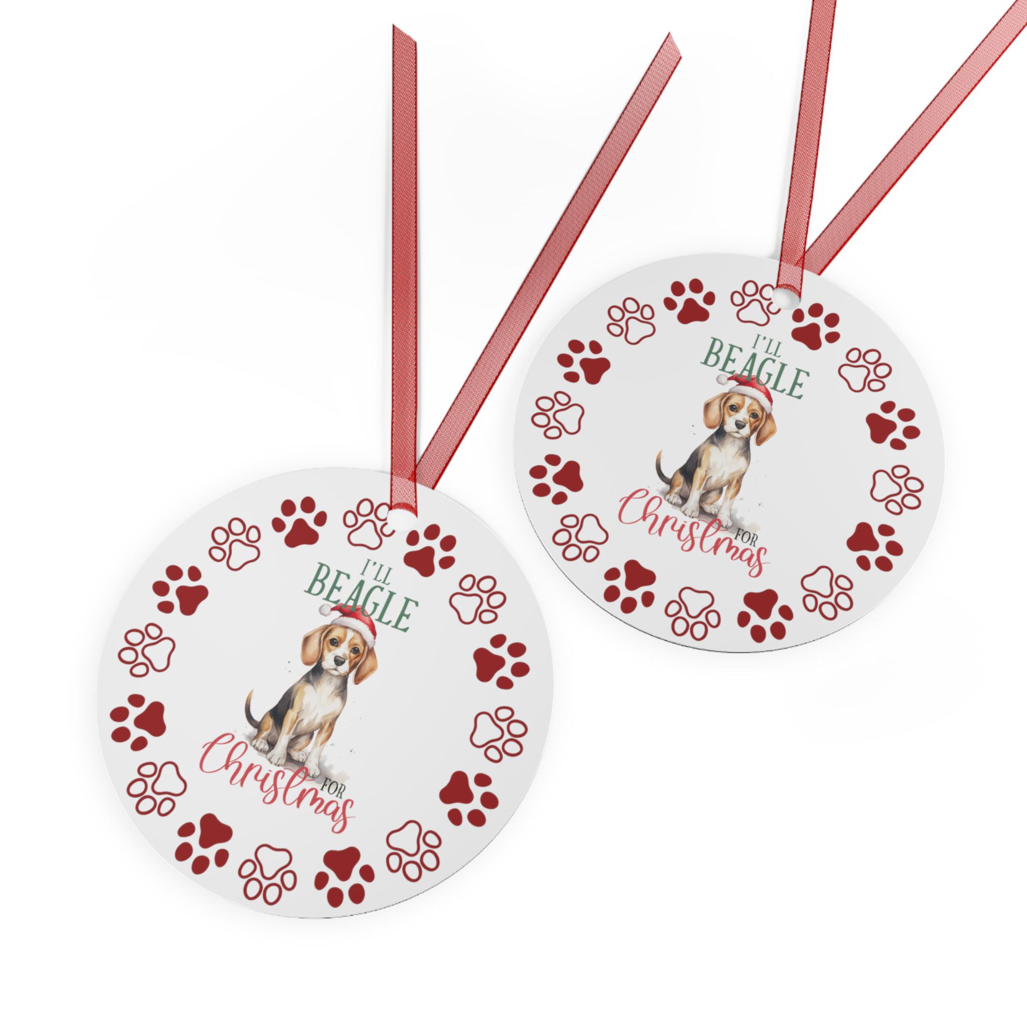 This Round Red Paws Beagle Christmas Ornaments feature a 'I'll Beagle for Christmas', design on both sides, making them a festive and unique addition to any dog lover's Christmas tree. Perfect as a holiday gift for Beagle dog moms or dad, these ornaments come in round and vibrant colors, made from durable aluminum material with a glossy finish.