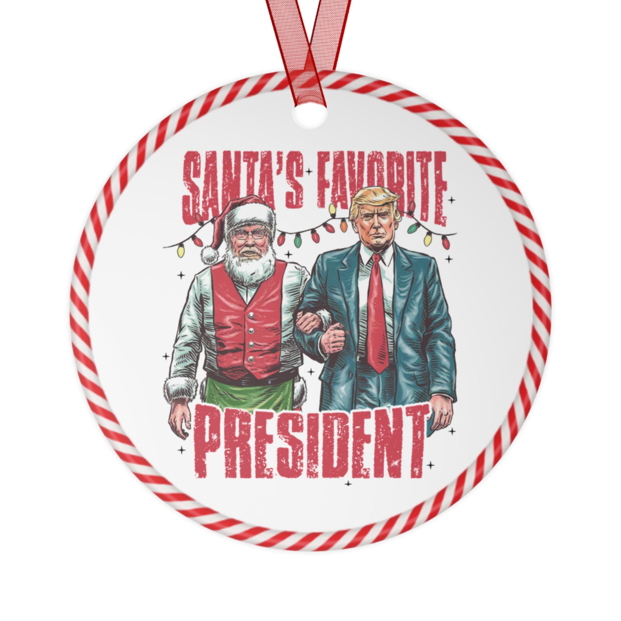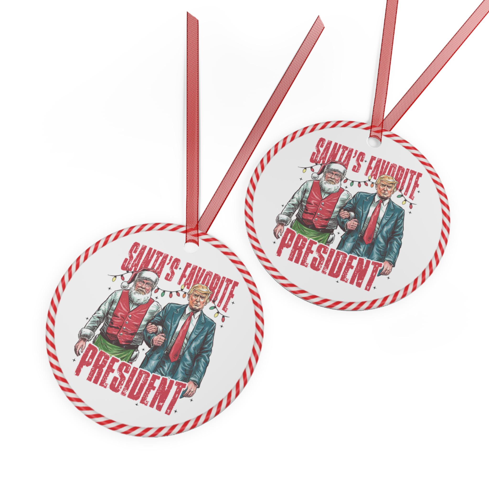 This Christmas Ornament features a unique design with images of Santa and President Donald Trump, making it a perfect holiday decoration for supporters of the president with vibrant colors and a durable aluminum material. Each ornament has a hole for hanging and comes with a red ribbon, making it easy to decorate your tree or walls.