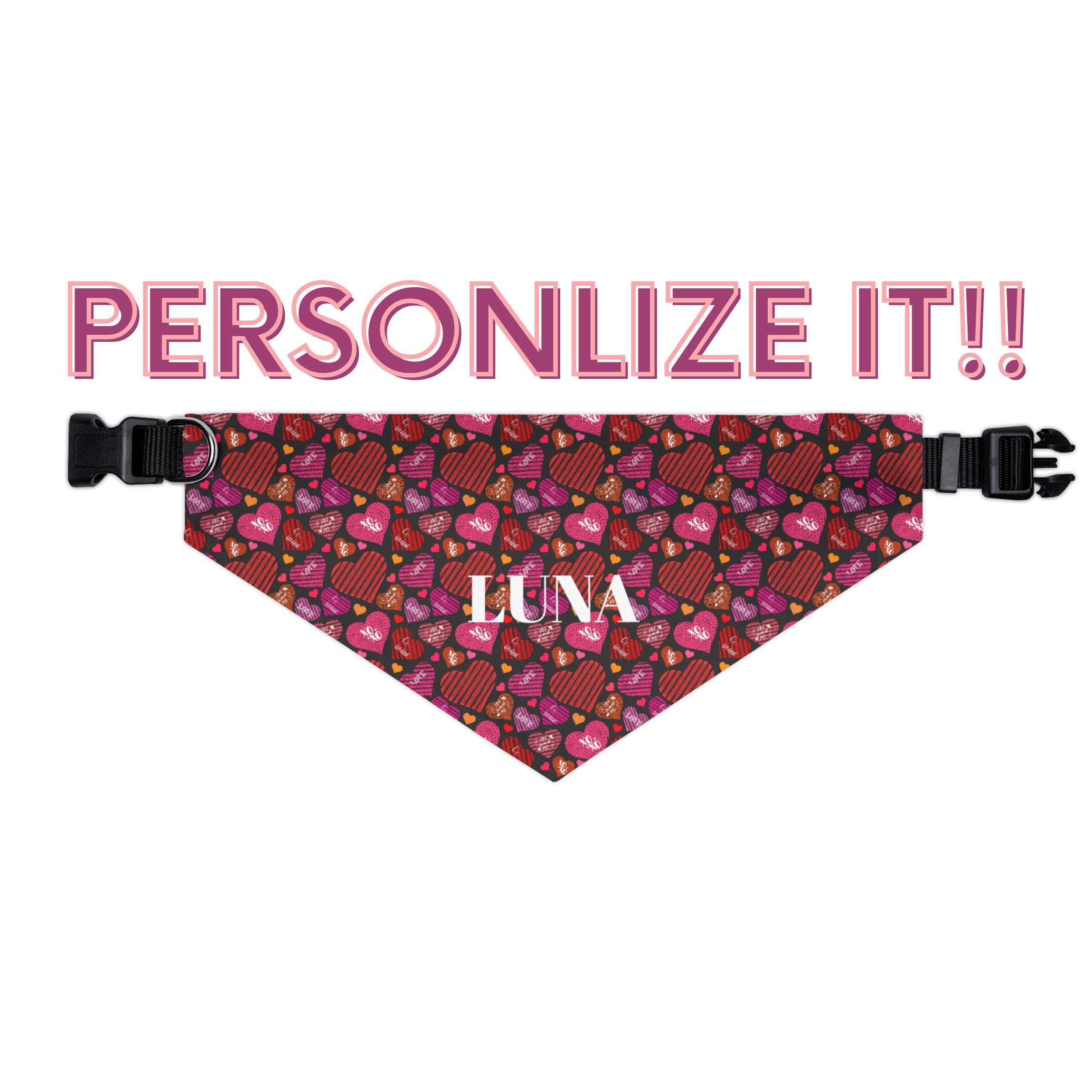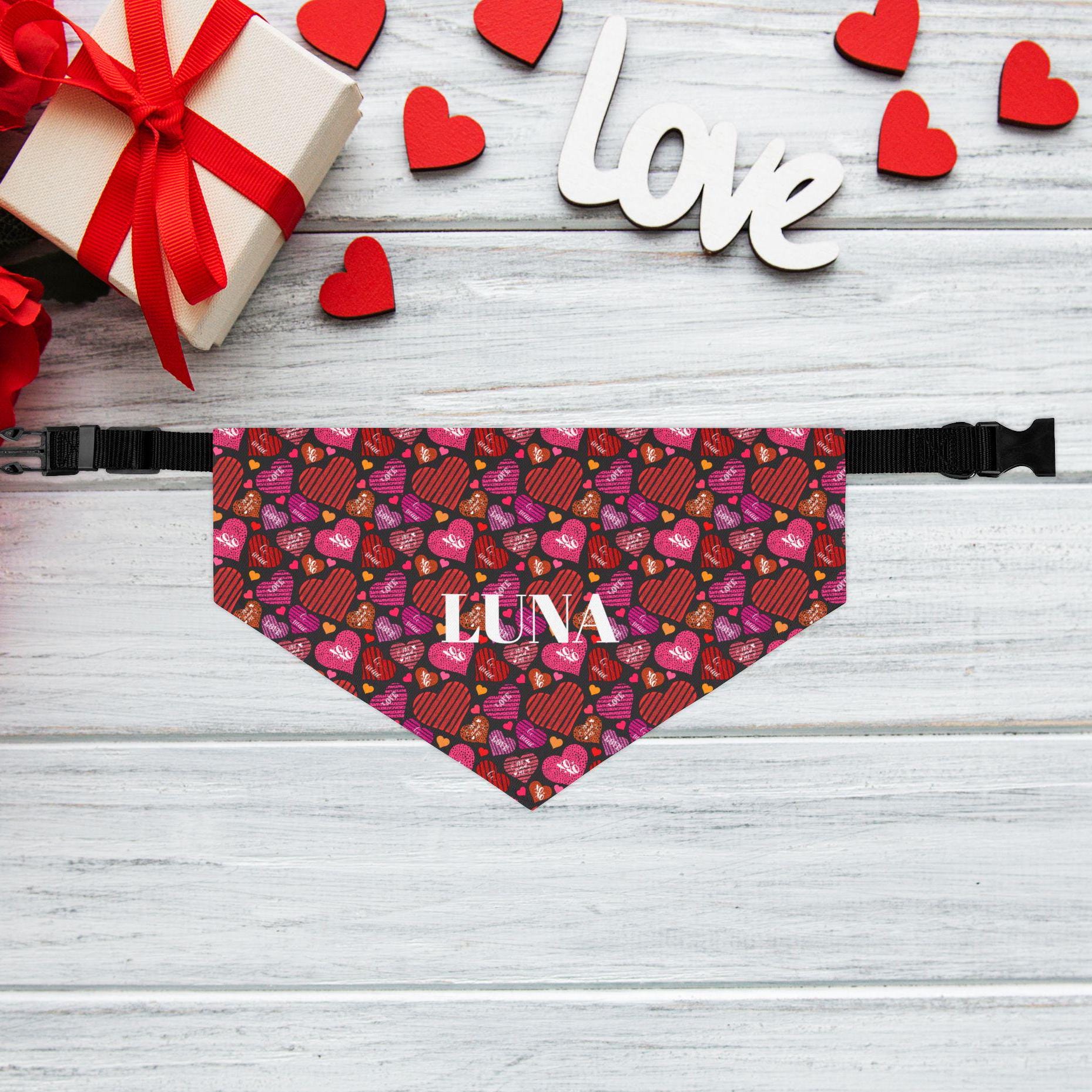 Personalized Bandana Collar for pets, featuring a cute heart print design for a stylish V-Day fashion look. Perfect for pet parents looking to dress up their furry friends for Valentine's Day.