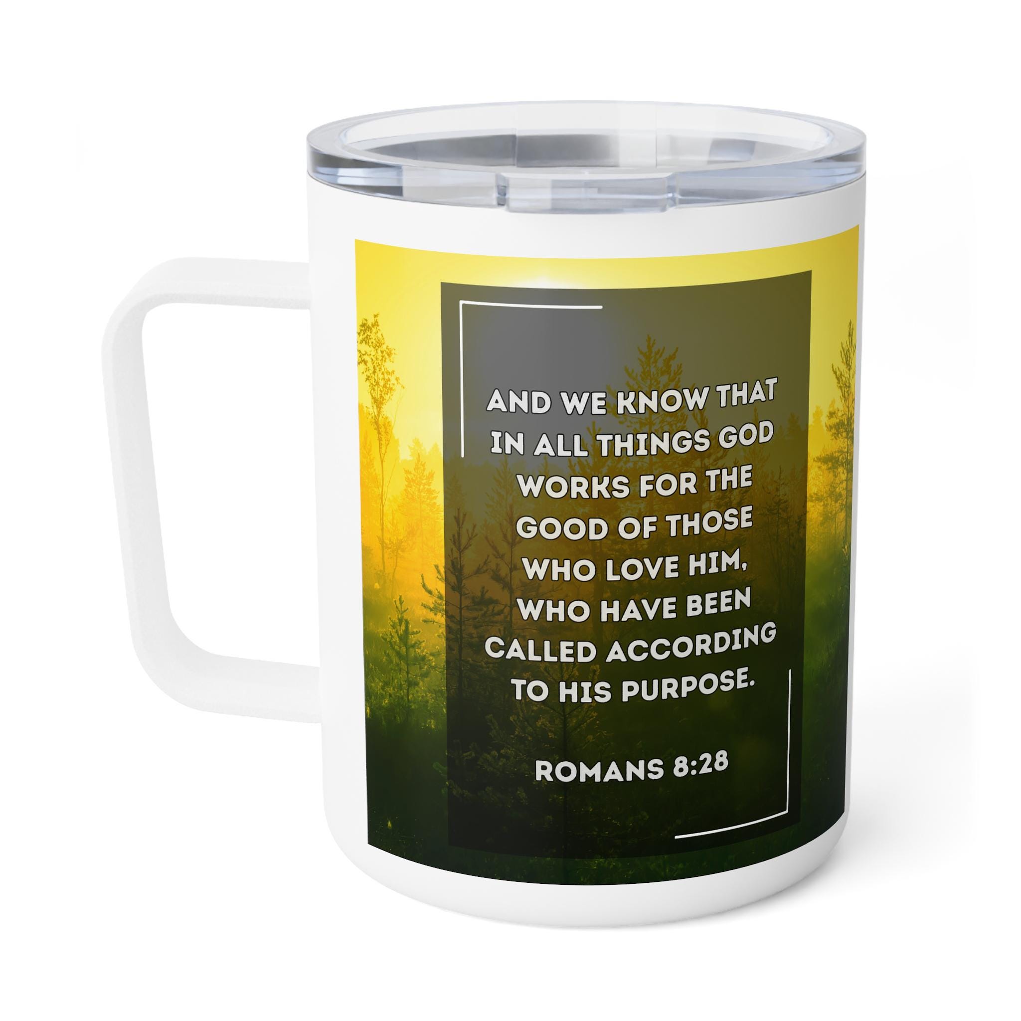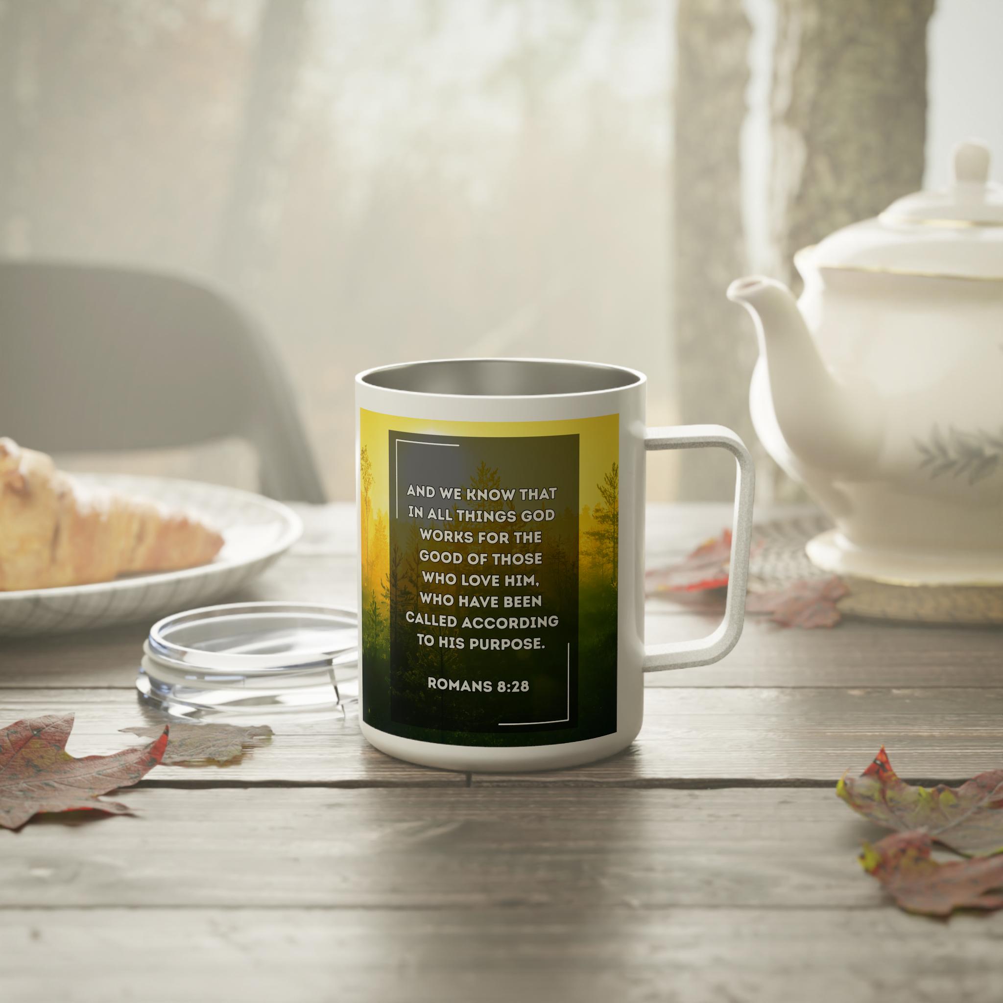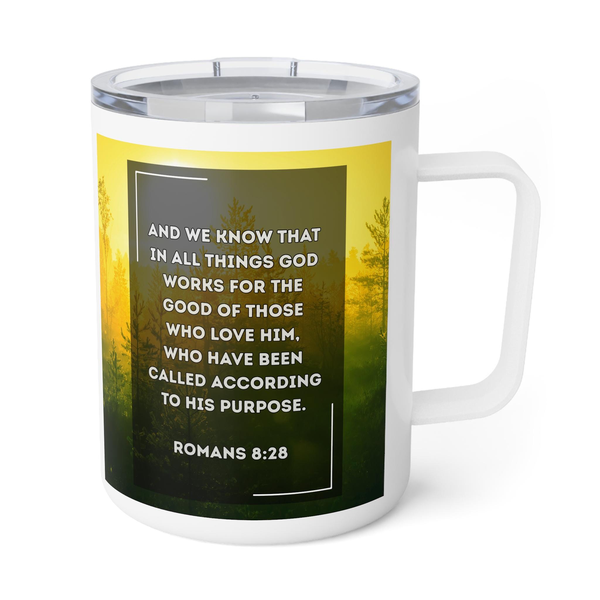 This inspirational insulated coffee mug is the perfect gift for any Christian looking for a motivational drinkware for home & office. The Romans 8:28 quote adds a touch of spiritual encouragement to your daily routine. Ideal for religious holidays, celebrations, and as a thoughtful gift for believers.