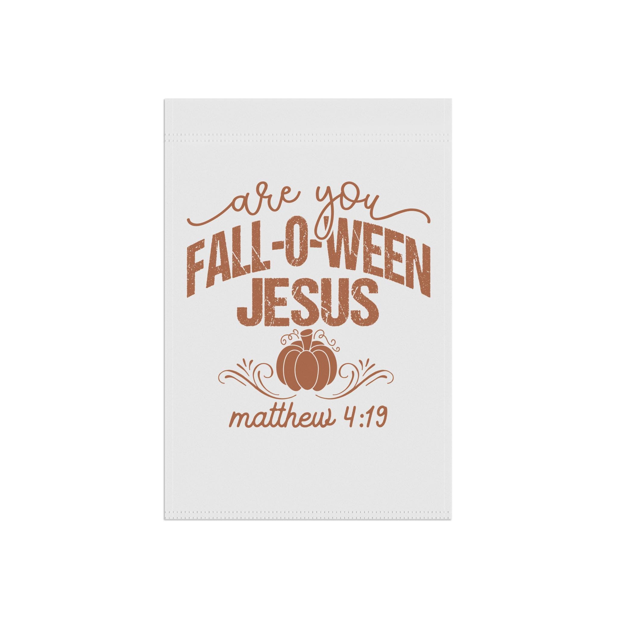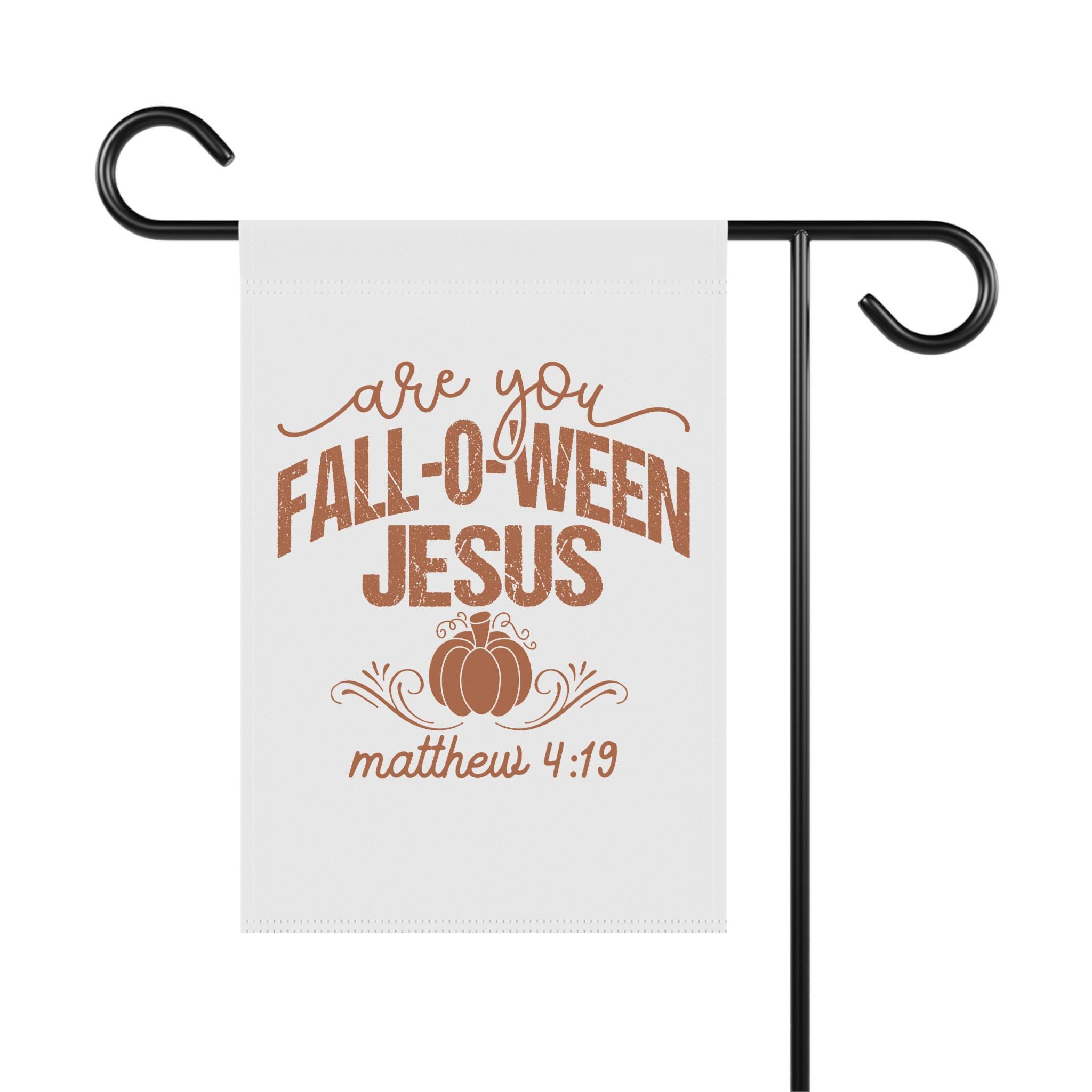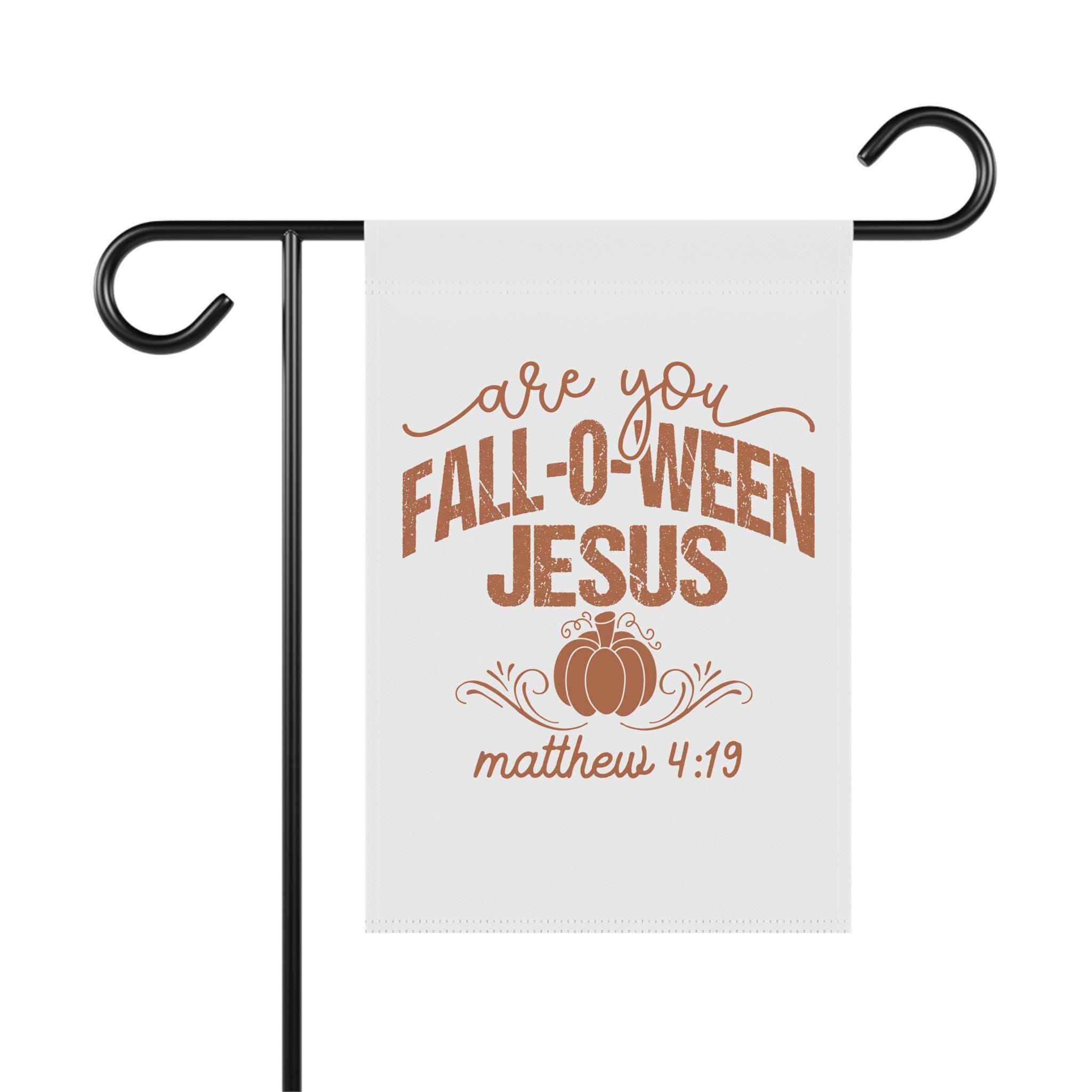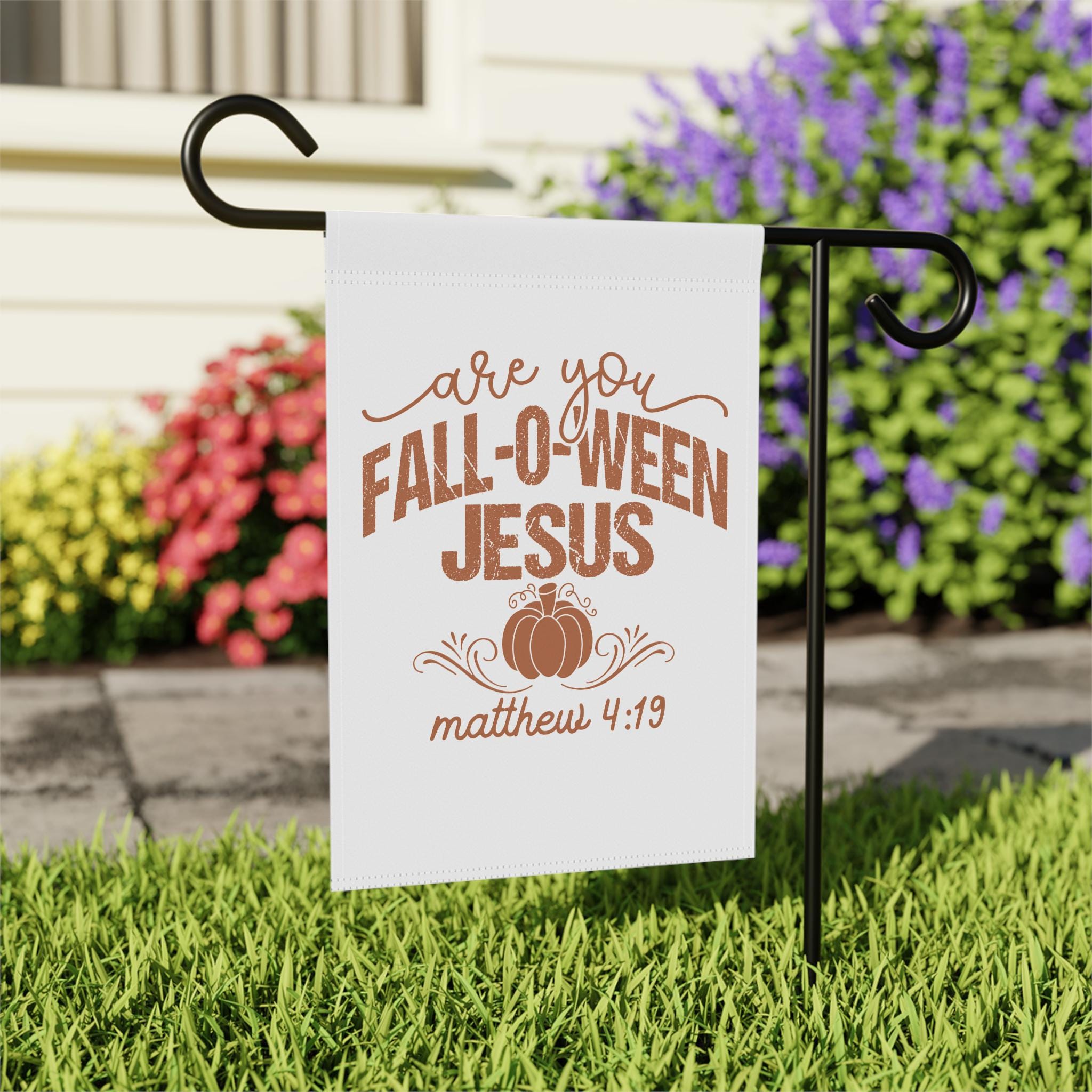 Elevate your outdoor decor with this Fall-O-Ween Garden Banner, featuring vibrant colors and a religious design. Perfect for autumn and Halloween celebrations, this banner is made of lightweight poly poplin-canvas fabric with sleeves at the top for easy hanging on flagpoles or stands. Relevant to those looking to add a festive touch to their garden or house for the upcoming holidays.